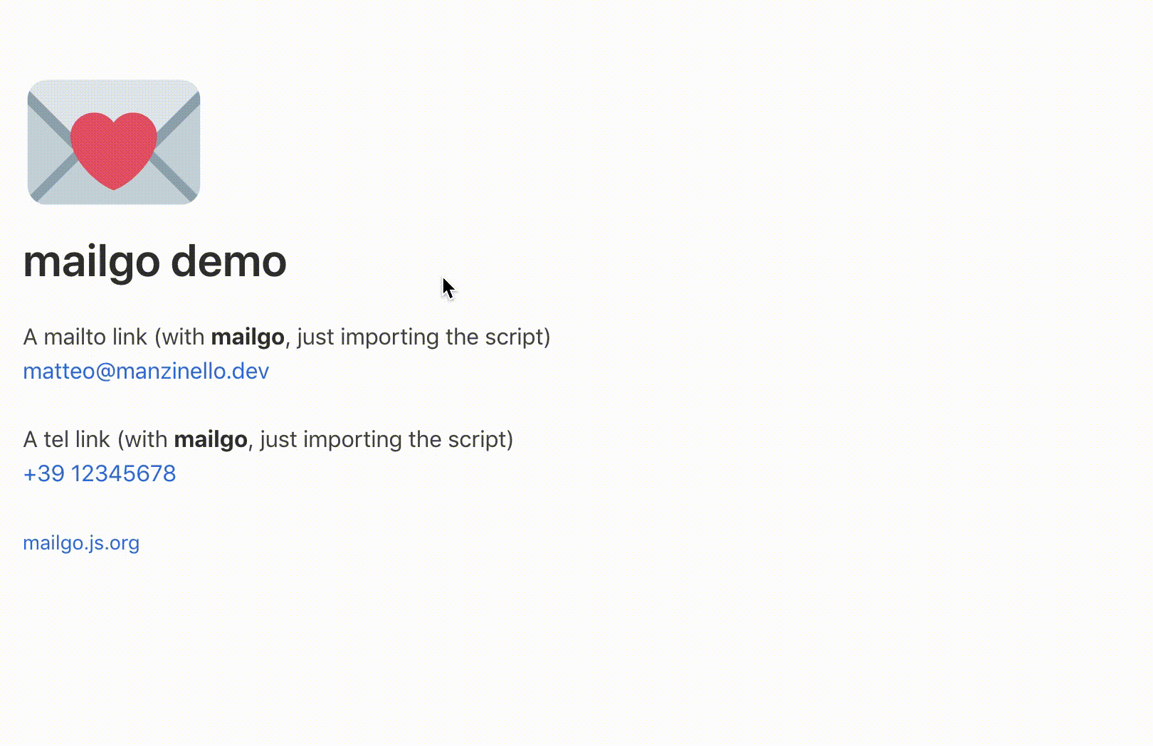 Mailgo – крошечная библиотека, которая автоматически заменяет ссылки «mailto» и «tel» на линки c красивым всплывающим окном, содержащим кнопки, позволяющие напрямую открыть письма в Gmail или Outlook, а телефонные номера в Telegram, Skype или WhatsApp.