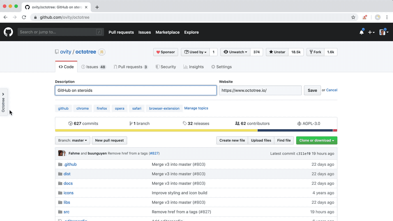 Octotree – расширение браузера, которое отображает дерево кода в репозиториях GitHub и значительно улучшает способ просмотра файлов в библиотеках и проектах с открытым исходным кодом. Доступно в Chrome, Firefox, Safari и Opera.