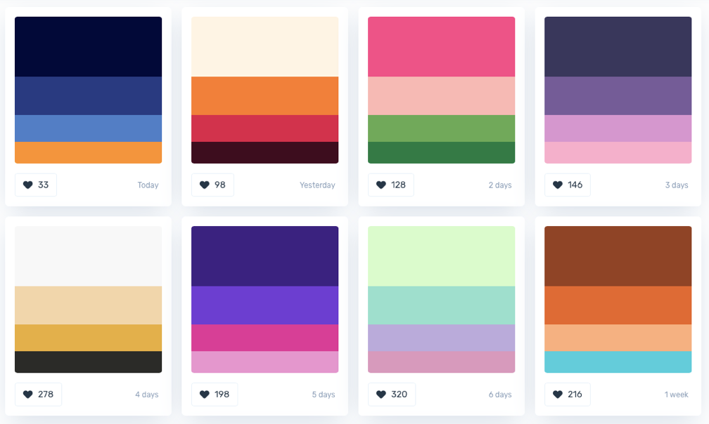 Color Hunt — это бесплатная открытая платформа для поиска вдохновения. Преимущества этого сайта в огромном количестве модно подобранных цветовых решений. Color Hunt позволяет найти трендовые комбинации, собравшие наибольшее количество лайков, а также сохранять и скачивать понравившиеся подборки.
