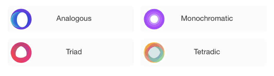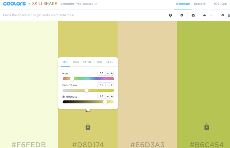 Coolors — cупер-быстрый генератор цветовых схем. Получив готовую схему цветов, появляется интерактивная площадка, включающая меню редактирования для каждого цвета: можно поменять расположение цветов местами, изменить шестнадцатеричный код на желаемый или выбрать его оттенок нажатием иконки «альтернативные оттенки», а также скорректировать яркость и насыщенность в нужной цветовой модели.