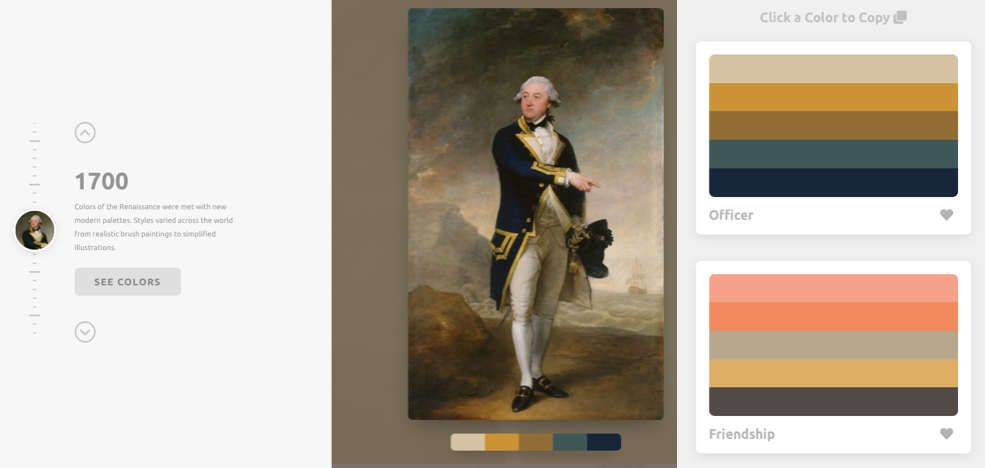 Поиск классных цветовых решений из картин различных исторических эпох — Color Leap. Этот интерактивный сайт насыщен анимационными компонентами и предлагает цветовые палитры картин выбранного периода с возможностью копирования кода при нажатии на цвет.