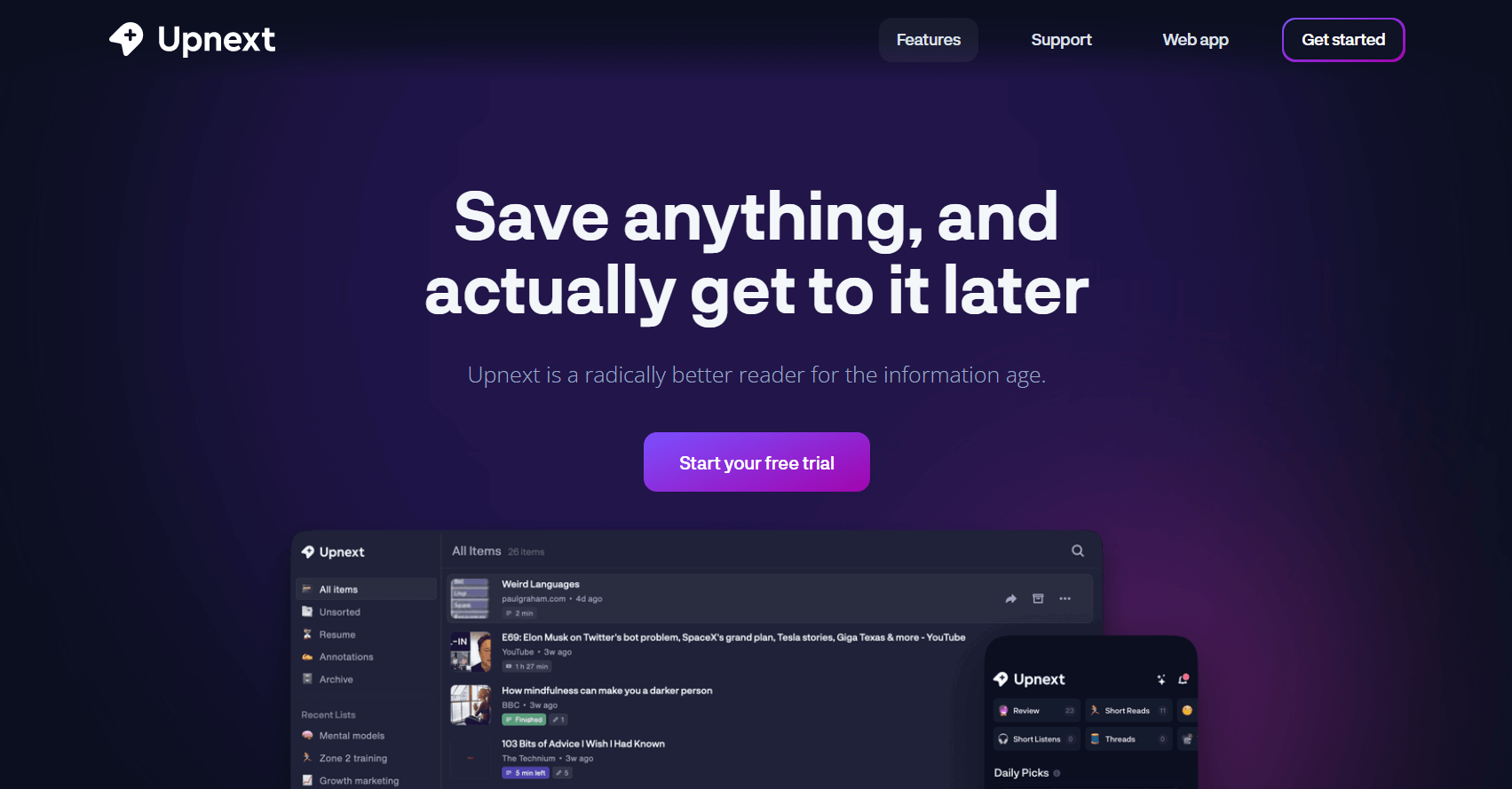 У приложения есть функция внутреннего поиска, поэтому вы можете искать нужные фрагменты сохраненных сайтов и статей, не выходя из программы. Программа также сама отслеживает обновления конкретных сайтов, блогов или рассылок, чтобы вы могли быстро добавить интересный контент в свою виртуальную библиотеку. К сохраненным элементам можно добавлять свое описание и заметки. Также Upnext можно подключить к приложению для заметок Readwise и выгружать в него ключевые моменты из сохраненных материалов.