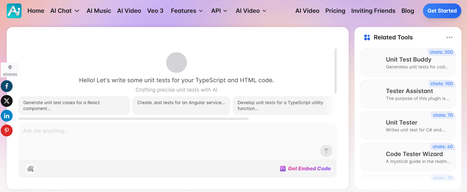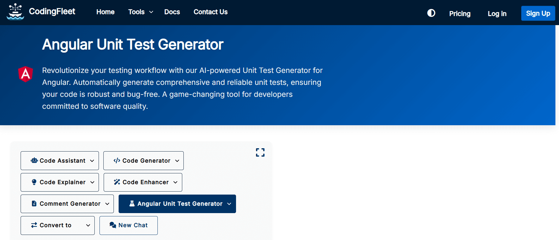 Еще один генератор тестов, но с расширенными возможностями. Есть бесплатная версия с ограничениями, а полный функционал доступен по подписке стоимостью от 9$ в месяц. Генератор Angular-тестов от CodingFleet умеет:
