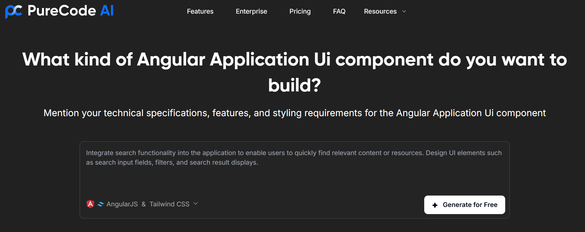 С помощью PureCode вы сможете создавать интерфейсные компоненты для Angular по текстовому описанию. Вы задаете в промпте структуру, тему и поведение, и получаете на выходе готовый код компонента с валидацией и стилями.