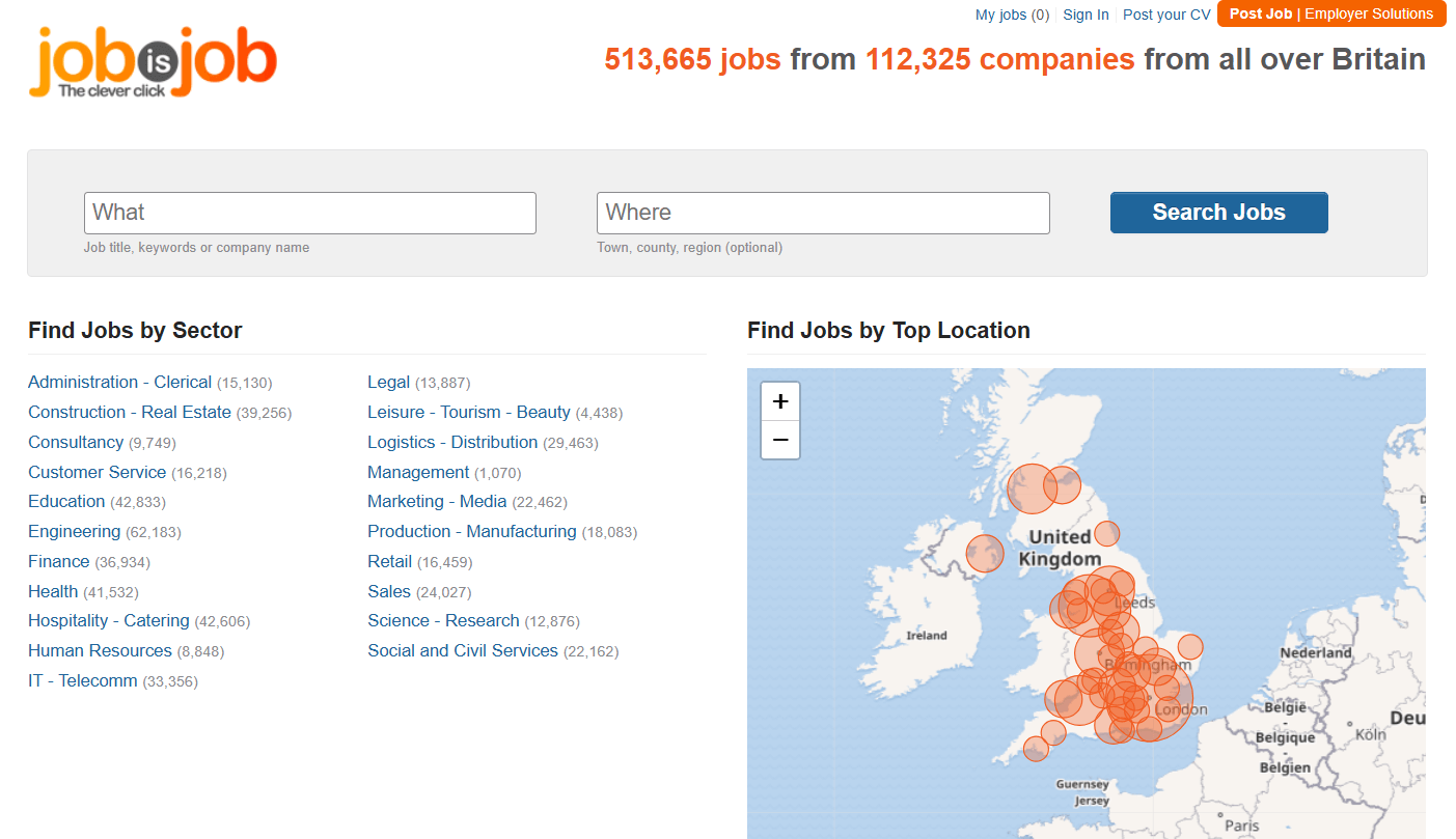 JobisJob — агрегатор вакансий с интересной особенностью. Он показывает, где в мире самый высокий спрос на вашу профессию. Можно посмотреть карту, сравнить страны и выбрать направление, где ваши навыки наиболее востребованы. Плюсы агрегатора: