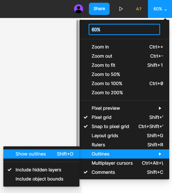 - В открывшемся боковом меню выберите пункт «Show outlines»