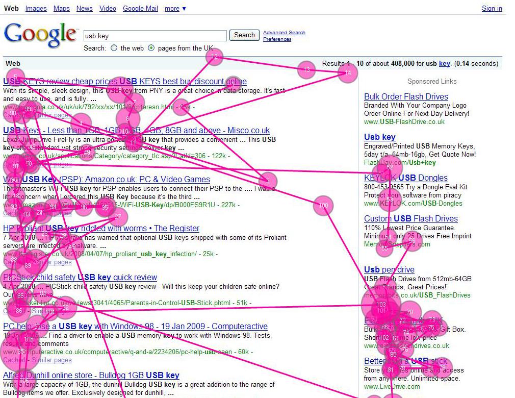 График фиксации взгляда позволяет проследить, как человек изучал страницу. Линии на этом графике показывают саккады, а точки — фиксации. Размер точки показывает время фиксации: чем оно больше, тем дольше человек смотрел в это место.