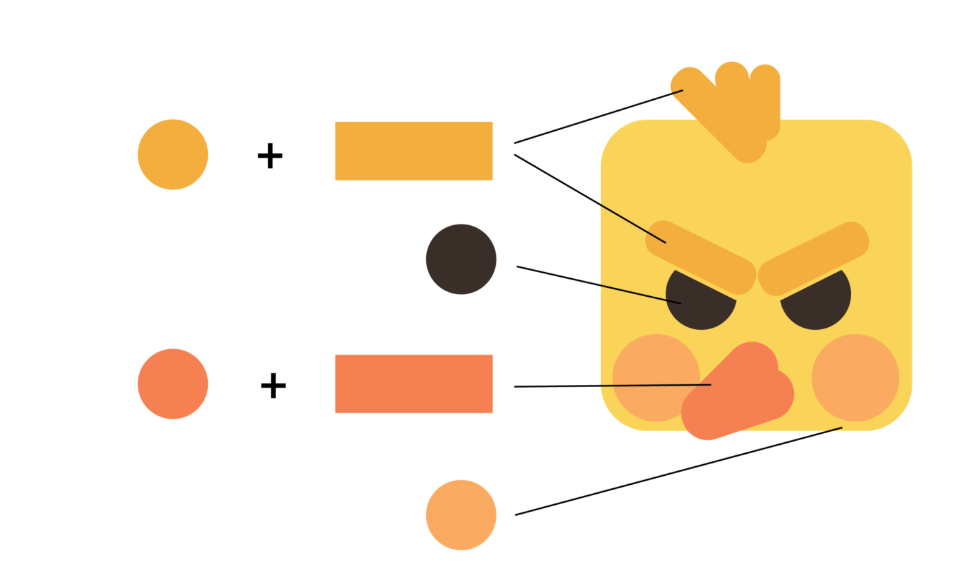 Пользуясь той же логикой, художник создает множество разнообразных объектов на основе базовых форм. Все вместе они составляют единую завершенную композицию. Вернувшись к примеру с птичкой, видно, что ее брови, волосы, клюв сочетают в себе признаки круга и прямоугольника (базовых фигур или шаблонов). А для глаз и щек используются только круги.