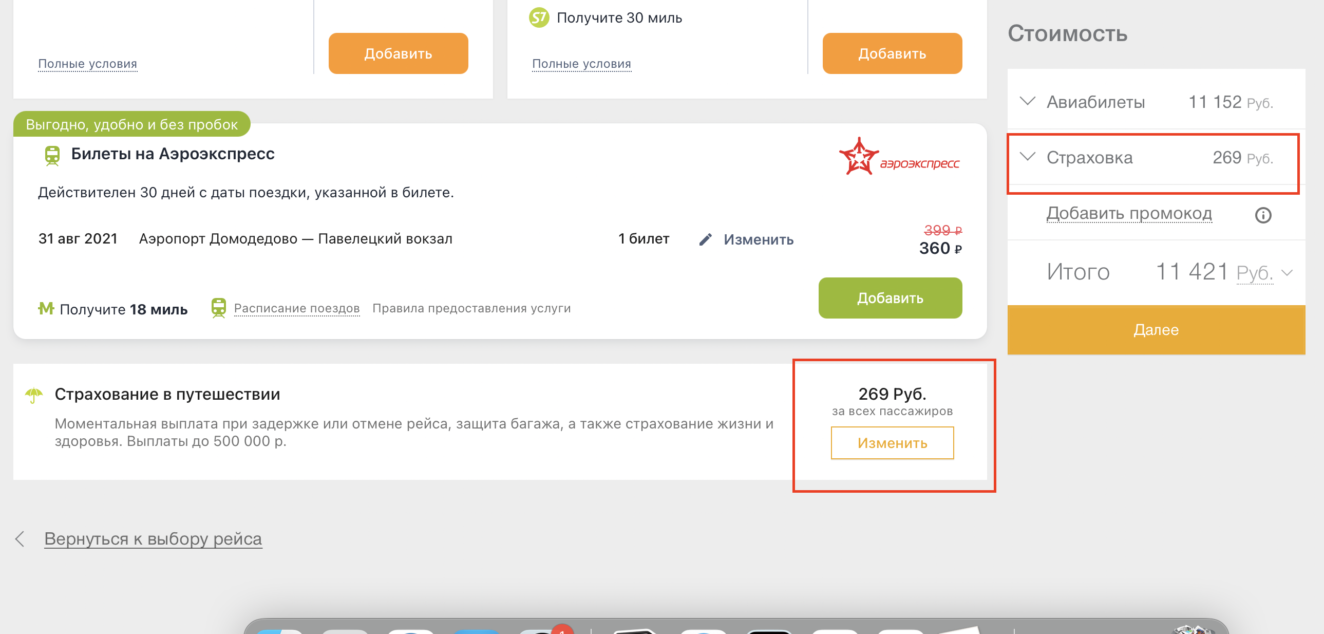 На последнем этапе оплаты товара пользователю вдруг предлагают оплатить ещё небольшую сумму: комиссию, страховку или налог. Например, S7 автоматически добавляет страховку. Если не убрать галочку, можно случайно подтвердить и заплатить на 269 рублей больше.