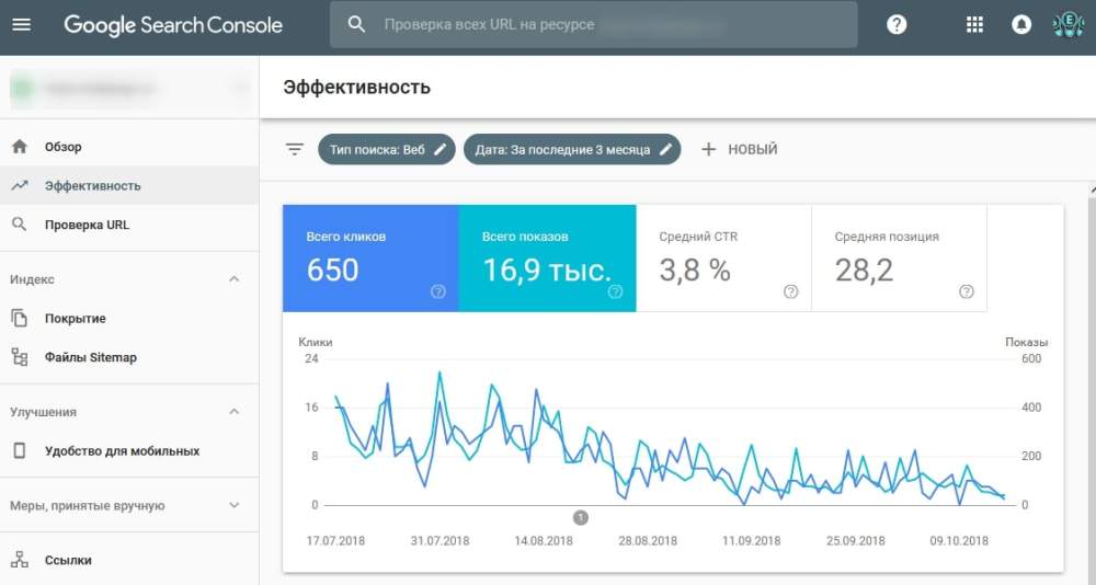Во вкладке «Эффективность» сервиса Google Search Console нужно проверять отчеты по кривой эффективности сайта. Здесь есть статистика по кликам, показам, среднему CTR и средней позиции сайта: