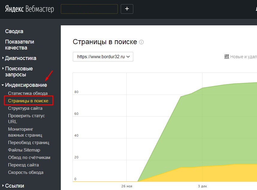 Раз в месяц нужно проверить, с какой скоростью индексируются новые страницы. Эти данные можно увидеть в разделе «Индексирование», используя сервис «Яндекс.Вебмастер»: выберите пункт «Страницы в поиске» и в правом углу кликните «Новые и удаленные». Внизу отобразятся последние изменения страниц, связанные с индексацией: