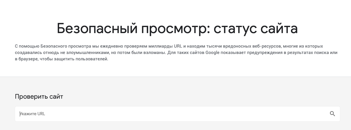 Веб-сайт должен быть безопасным для пользователей. Также на сайт могут попасть вредоносные URL, которые сломают что-то на сайте или «утащат» конфиденциальную информацию. Для проверки сайта можно использовать Google Safe Browsing. Укажите свой домен и кликните по иконке лупы справа от поисковой строки: