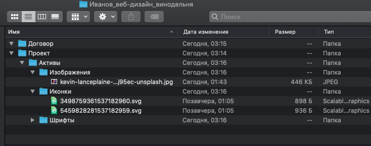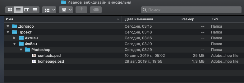 Также в папке с проектом создайте папку «файлы», где будут храниться файлы всех программ, которые были задействованы в разработке, например, файлы Photoshop, Sketch, Adobe XD, Illustrator и другие.
