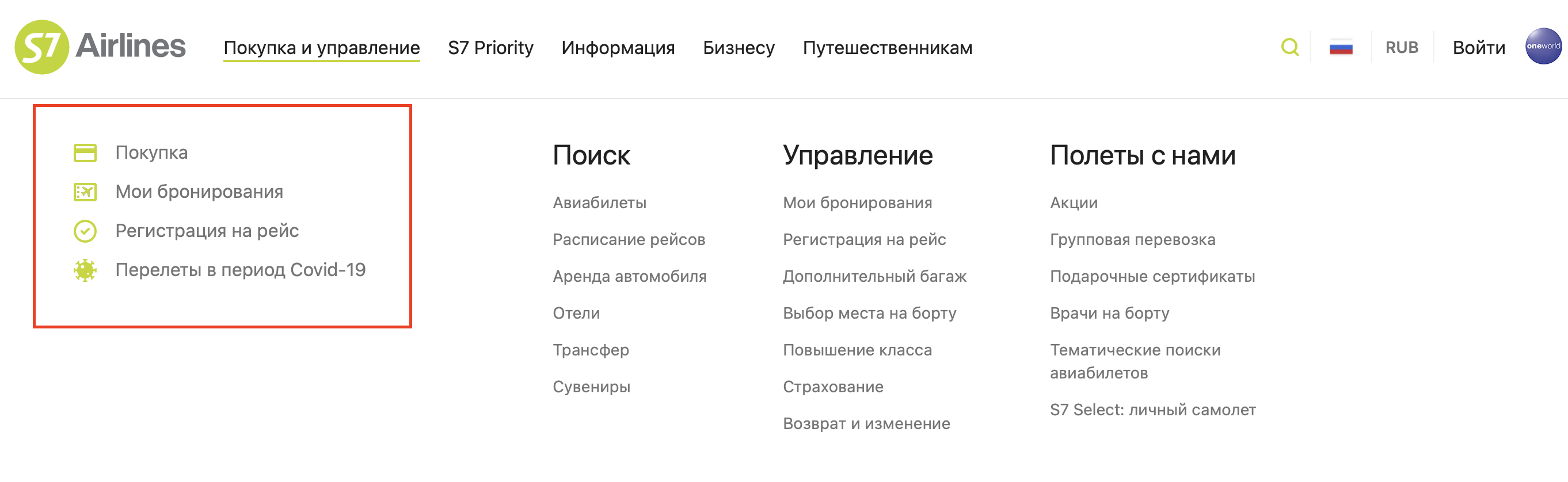 Посетителям сайта бывает сложно ориентироваться на странице с огромным количеством текста. Чтобы помочь пользователям быстрее найти нужную информацию можно использовать легко узнаваемые обозначения рядом с важными разделами описания товара. Например, на сайте S7 использованы маленькие значки (банковская карта, список с рейсами, чек-поинт, иконка вируса) в разделе «Покупка и Управление» для того, чтобы направить внимание пользователей на нужный раздел.