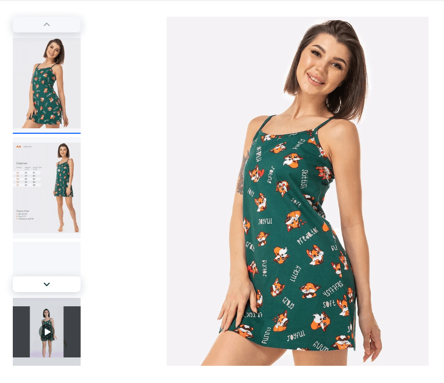 Добавьте несколько фото в формате слайдера, чтобы клиенты могли увеличить изображения и рассмотреть товар со всех сторон. Желательно, чтобы в карточке были как фотографии товара отдельно, так и в процессе использования (мебель в интерьере, помада на губах, одежда на модели, идущей по улице, например). Лучшая позиция для блока с фото — слева в верхней части страницы.