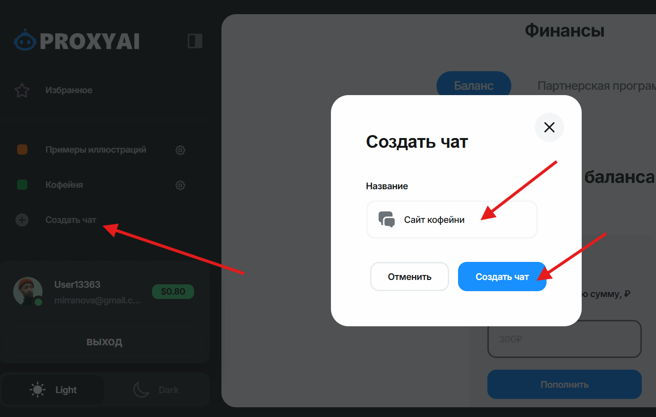 - Нажимаем в боковой панели кнопку «Создать чат», вводим название и вновь кликаем «Создать чат».