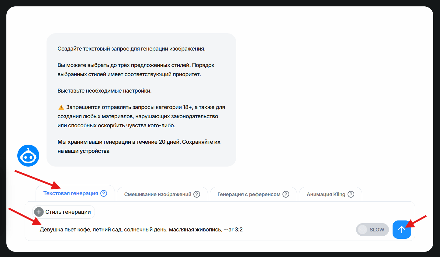Например: «Девушка пьет кофе, летний сад, солнечный день, масляная живопись, --ar 3:2».
