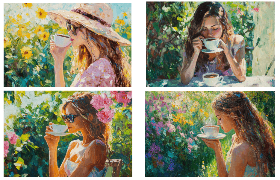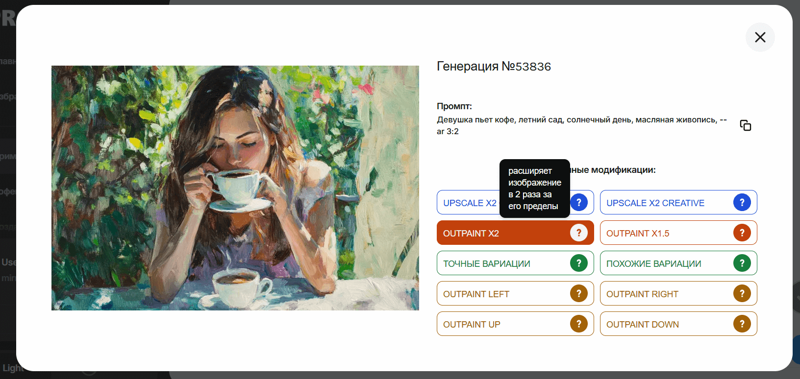 Используем для примера наш запрос «Девушка пьет кофе, летний сад, солнечный день, масляная живопись, --ar 3:2».