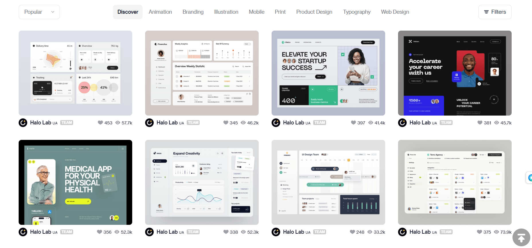 - Dribbble — своеобразная социальная сеть для дизайнеров, куда тоже часто заглядывают рекрутеры и заказчики в поисках специалистов для сотрудничества или найма. Основное отличие от Behance в том, что здесь работы публикуются шотами. Это значит, что пользователь видит лишь небольшие фрагменты проекта в процессе разработки или финальный макет без подробностей. Часто Dribbble в этом отношении сравнивают с Twitter, где все так же коротко, быстро и конкретно