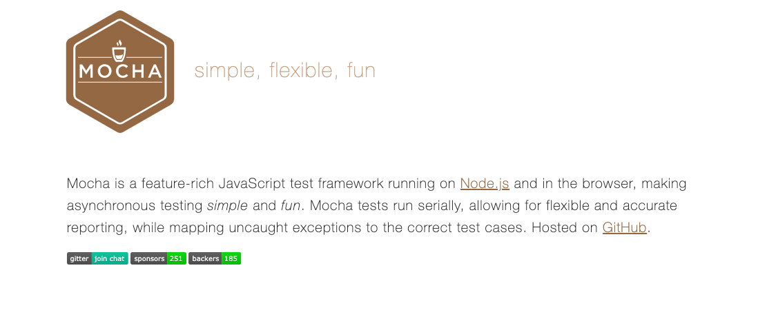 Mocha — это JS-фреймворк, облегчающий тестирование асинхронного кода в node модуле или браузерном приложении. Тесты в Mocha имеют улучшенное качество трассировки исключений и могут прогоняться сериями.