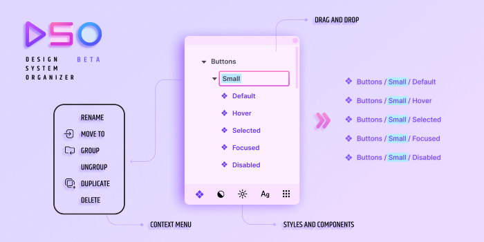 Если вы работаете над дизайн системой, у вас, вероятно, есть компоненты и стили, имена которых организованы в беспорядочном состоянии. Этот плагин помогает организовать такие элементы в удобном и понятном интерфейсе, позволяет группировать компоненты, разгруппировать их, перемещать и переименовывать. Когда вы переименовываете группу, имя будет изменено для всех компонентов или стилей в этой группе – вам больше не нужно использовать для этого инструменты поиска и замены.