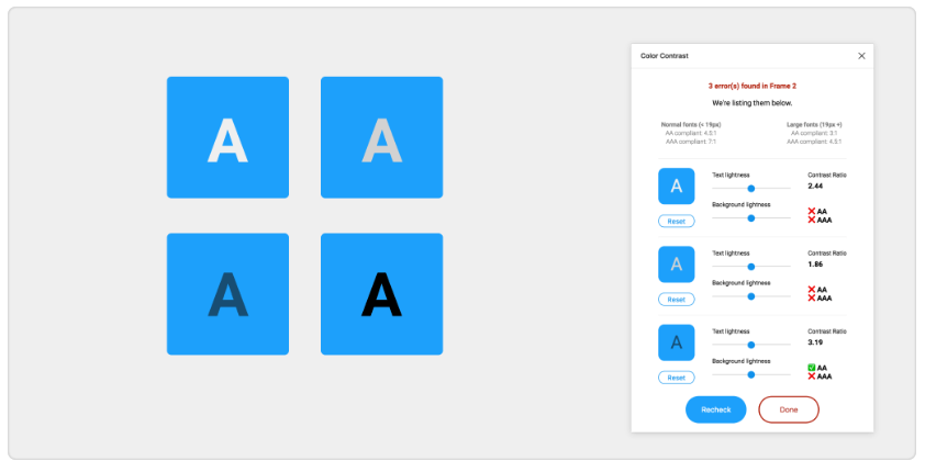 Расширение Color Contrast Checker для Figma автоматически проверяет контрастность цветов для всех элементов в выделенной части экрана. Затем плагин показывает, соответствует ли изображение требованиям Руководства по обеспечению доступности веб-контента WCAG, а также уровню AAA. Это высший уровень, означающий, что контент доступен для восприятия максимально широкому кругу людей, включая пользователей с ограниченными возможностями.