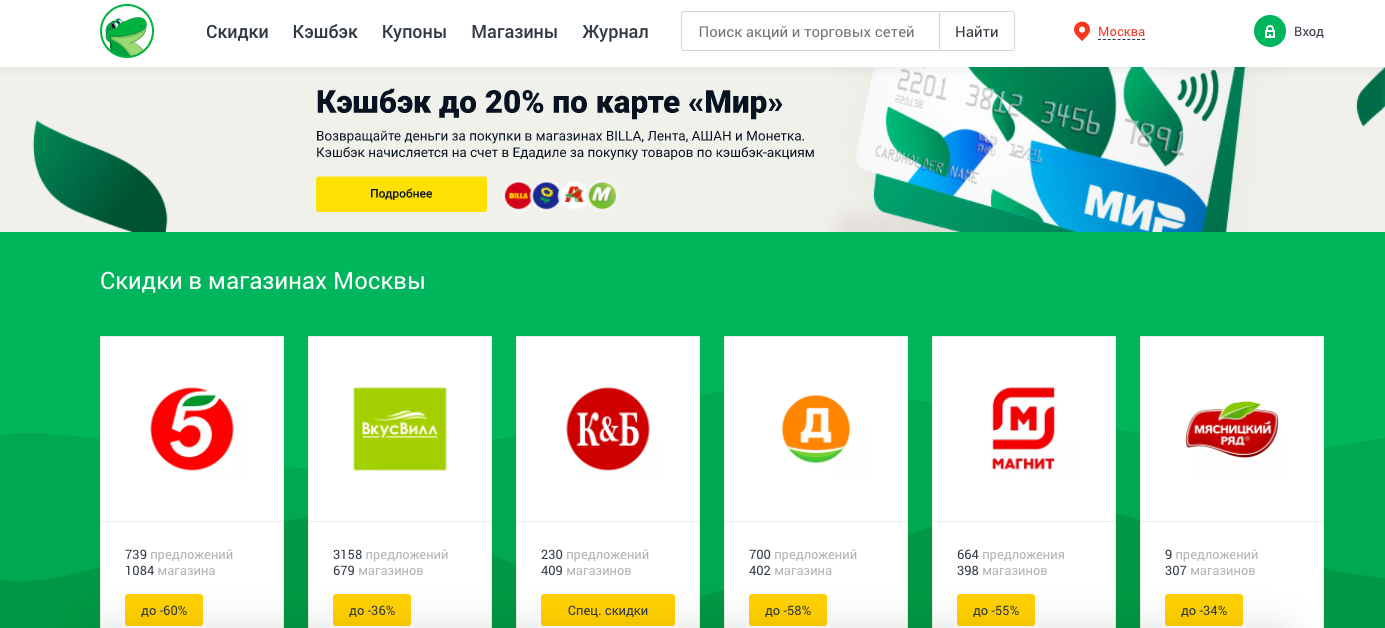 Всеми известный Едадил. Показывает, в каких магазинах проходят спецпредложения на продукты питания и сроки проведения акции. Примеров таких агрегаторов много — выдают купоны на развлечения, показывают промокоды на авиабилеты, собирают акции на одежду и товары для дома.