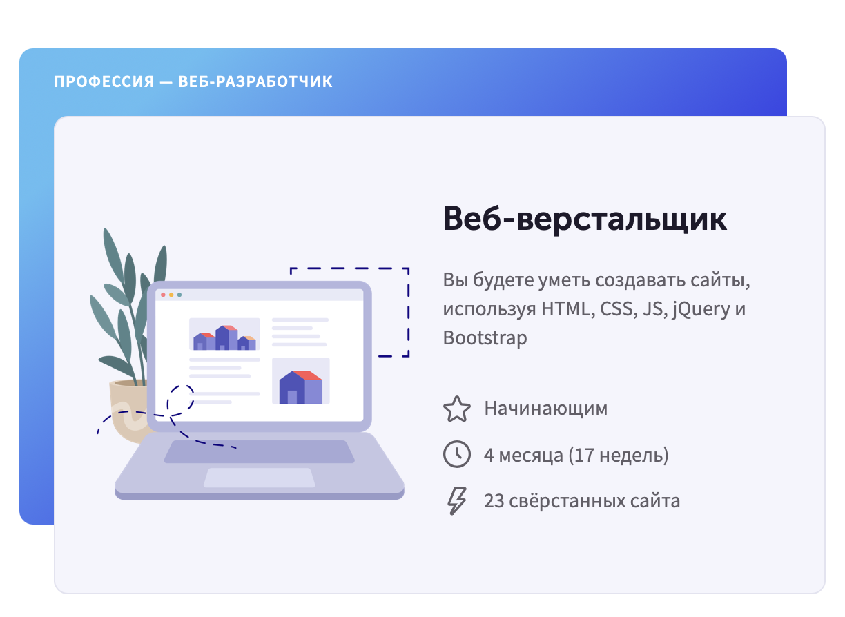 Разработка сайтов сегодня является одним из самых высокооплачиваемых направлений работы в IT-индустрии. Веб-верстальщик — это начинающий веб-разработчик, который делает вёрстку и фронтенд-часть сайтов. Вёрстка сайтов — это первая ступень веб-разработки, которая позволит быстро войти в сферу, начать зарабатывать деньги на фрилансе или устроиться на постоянную работу в компанию.