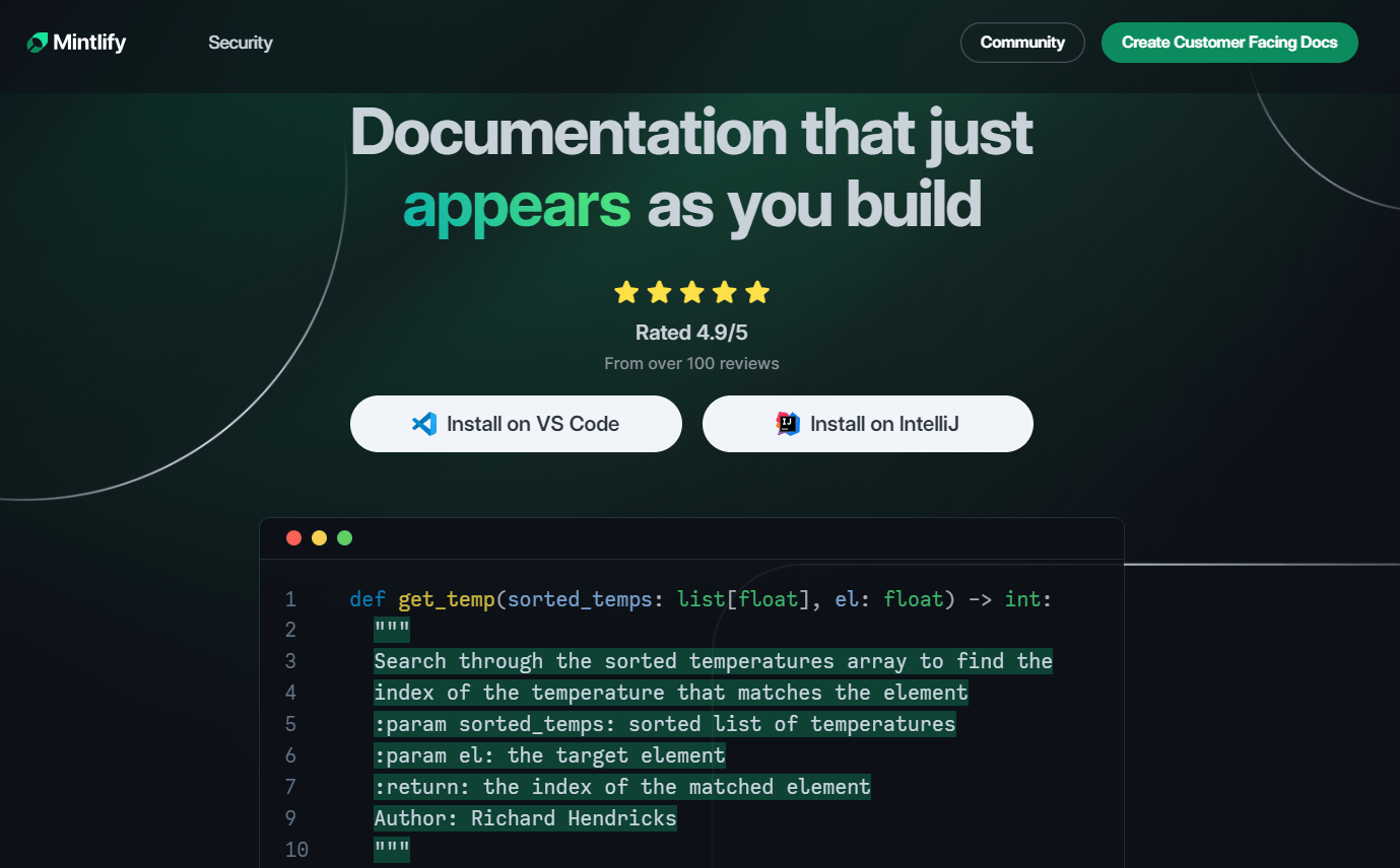 Mintlify Doc Writer интегрируется с VS Code, IntelliJ и другими популярными программами для написания кода. Установите Mintlify, и он автоматически сгенерирует подробную и при этом четкую и структурированную информацию по коду вашего проекта. Разработчики IT-решений по всему миру уже оценили высокое качество и точность документации, созданной с помощью данного сервиса.