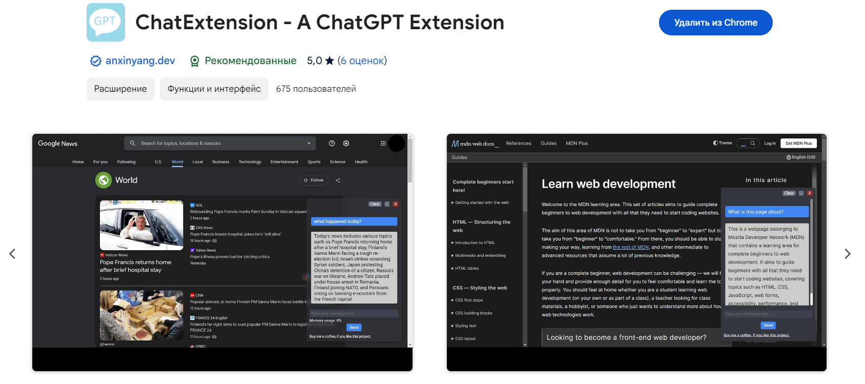 - Задавать ChatGPT вопросы по контенту в удобном интерфейсе прямо на просматриваемой странице, получая необходимые уточнения.
