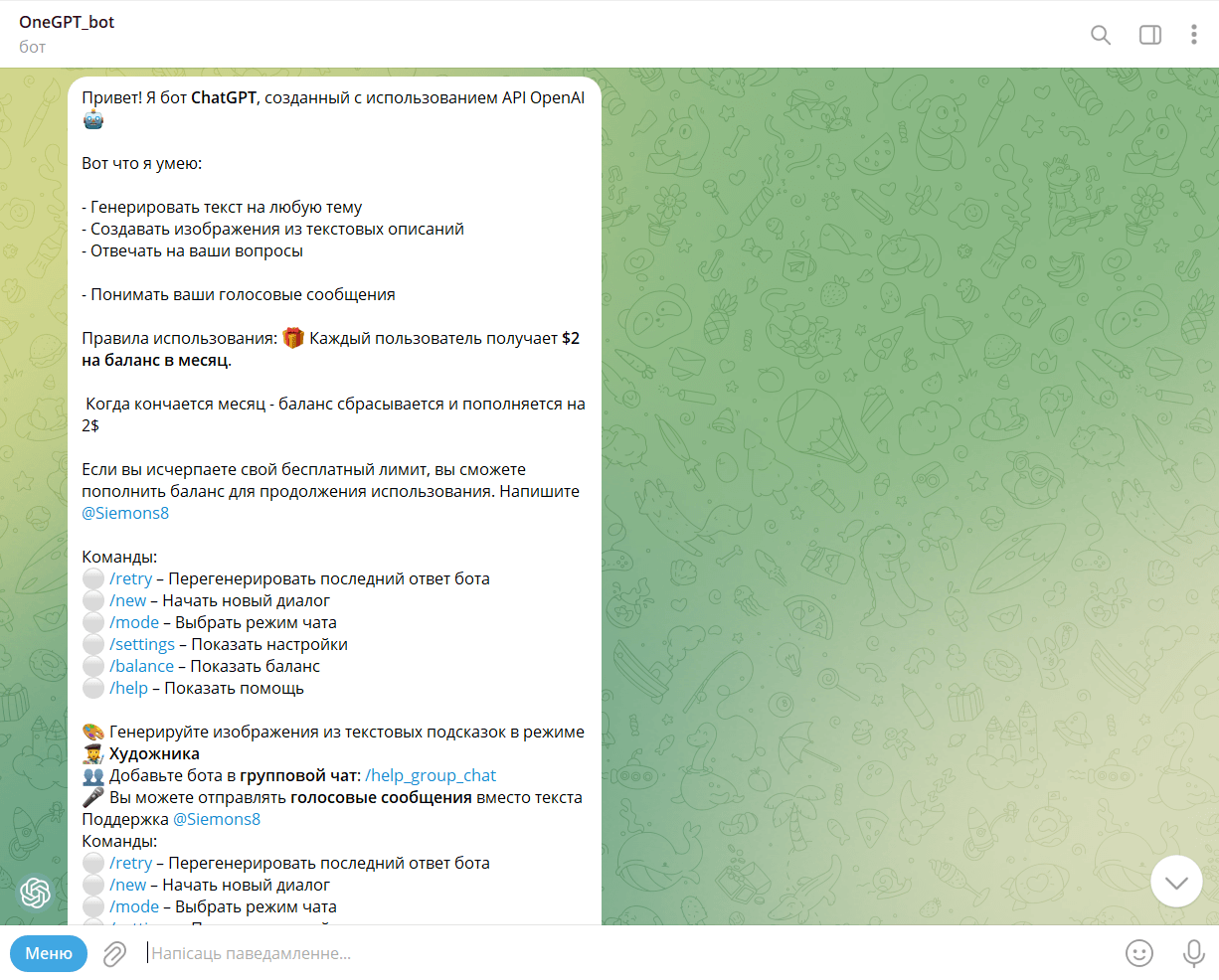 - ChatGPT ZS Bot – еще один бот с ChatGPT, доступ стоит 20 USDT в месяц. Обрел популярность из-за удобства и прозрачности, отсутствия скрытых ограничений и дополнительных условий.