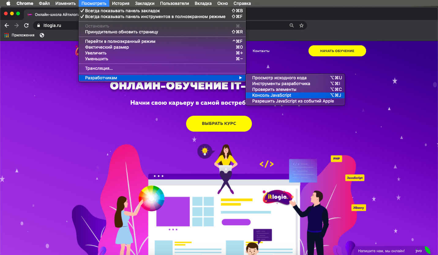 Чтобы открыть веб-консоль, нажмите следующую комбинацию клавиш: Ctrl + Shift + I (в Windows и Linux) и Cmd-Option-J (на Mac). Но также веб-консоль можно открыть, обратившись в меню «Посмотреть» в браузере и выбрать «Разработчик -> Консоль JavaScript».Веб-консоль появится в нижней или боковой части окна браузера. Внизу консоли находится строка, которую вы можете использовать для ввода JavaScript, а вывод отобразится на панели выше.