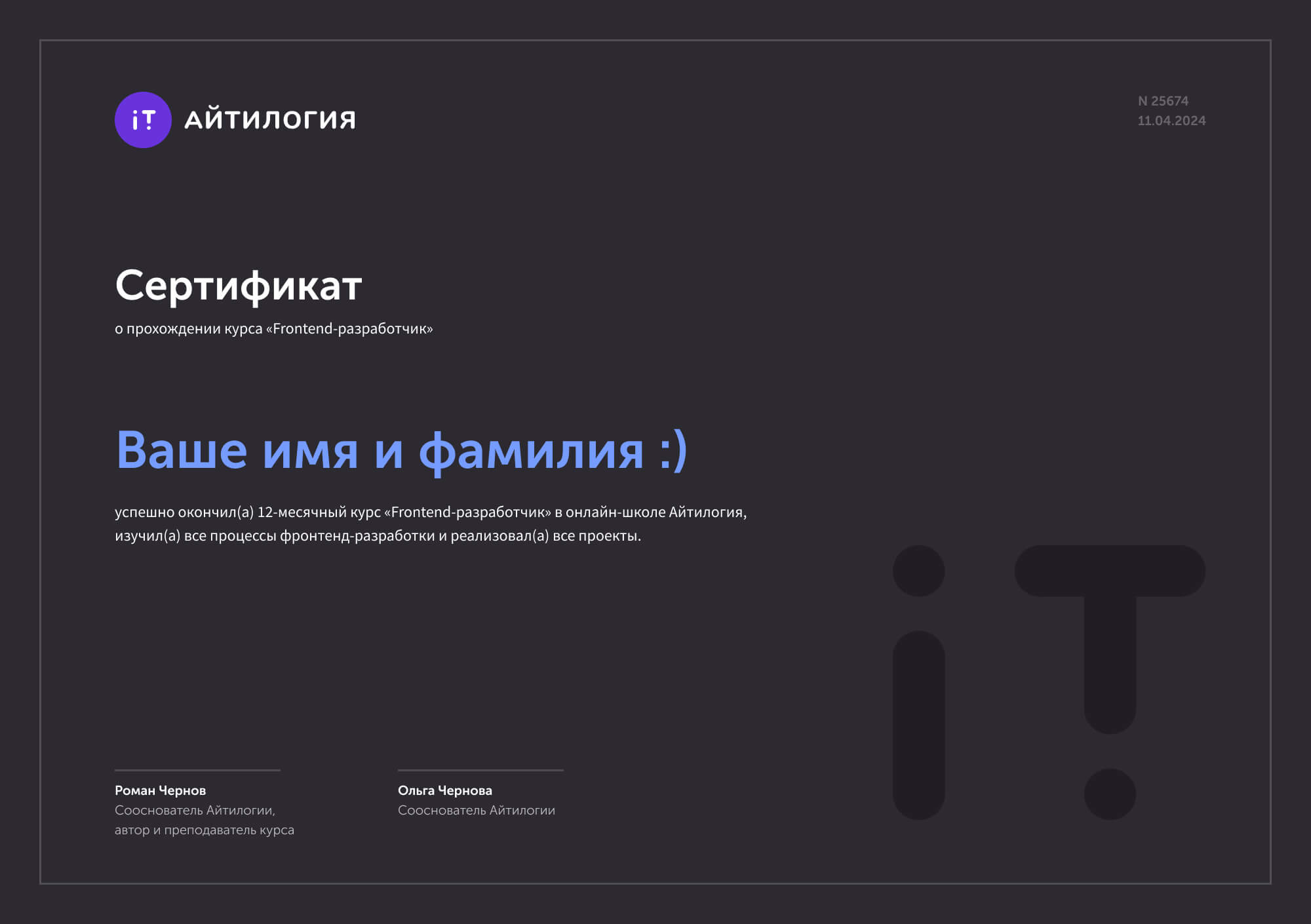 В конце обучения вы получите фирменный сертификат Айтилогии установленного образца. Мы обучаем по государственной лицензии №Л035-01298-77/00672052