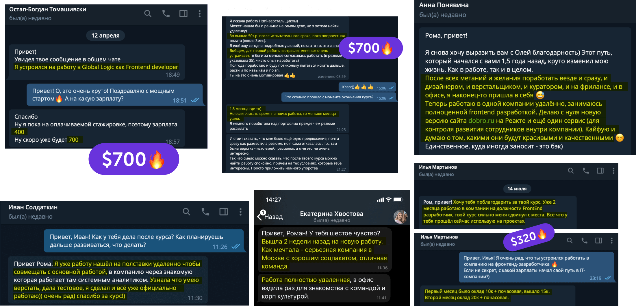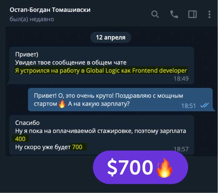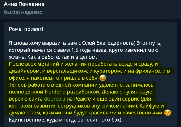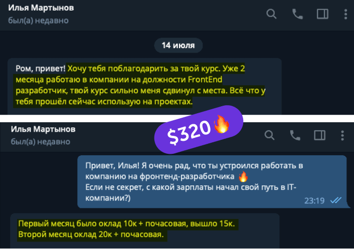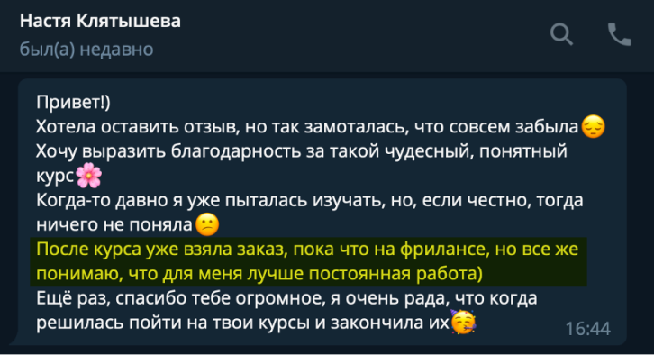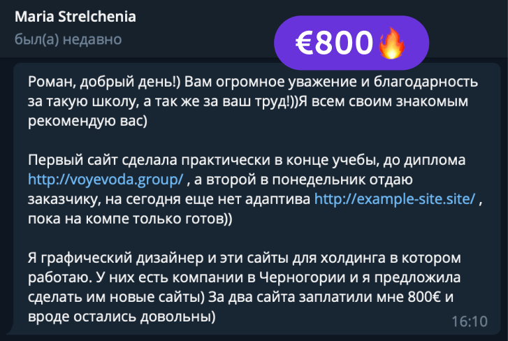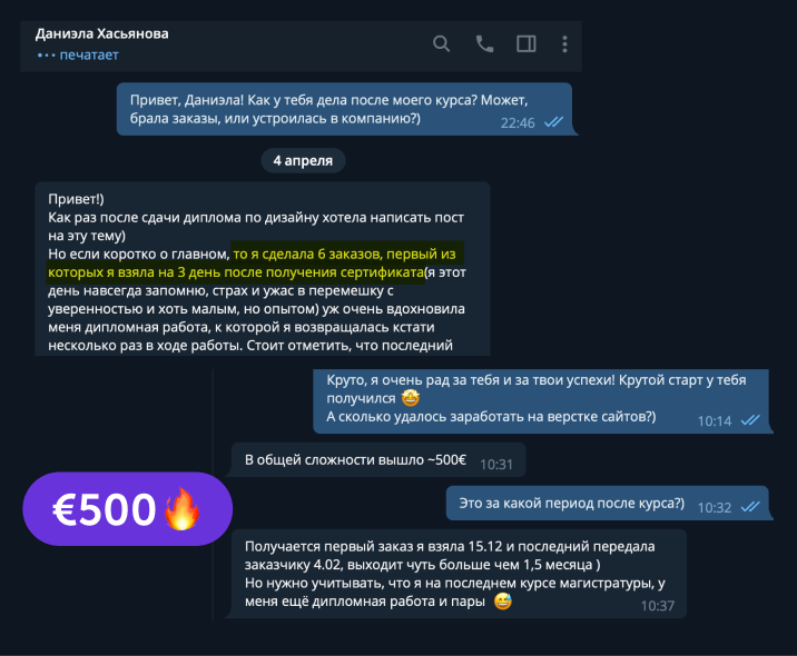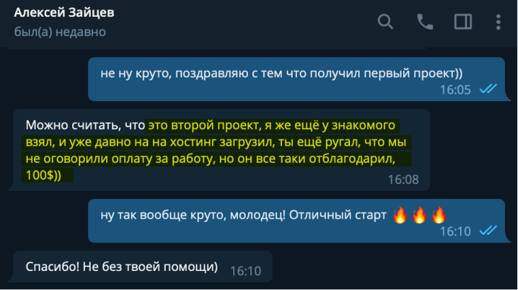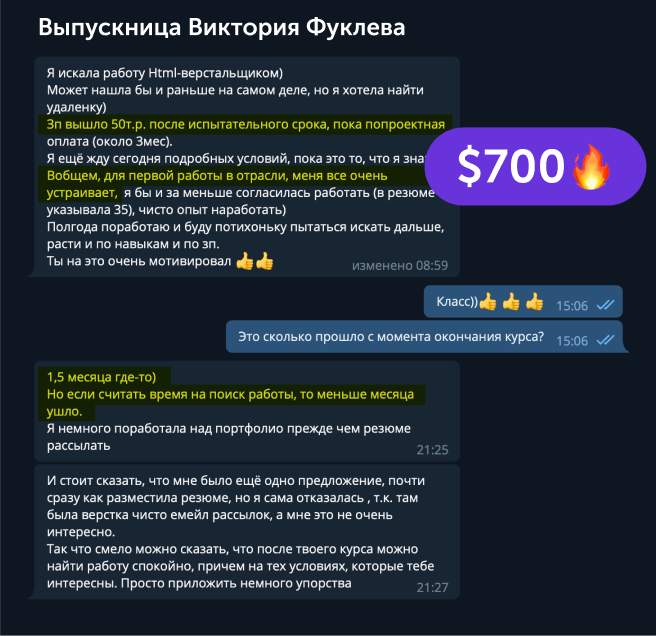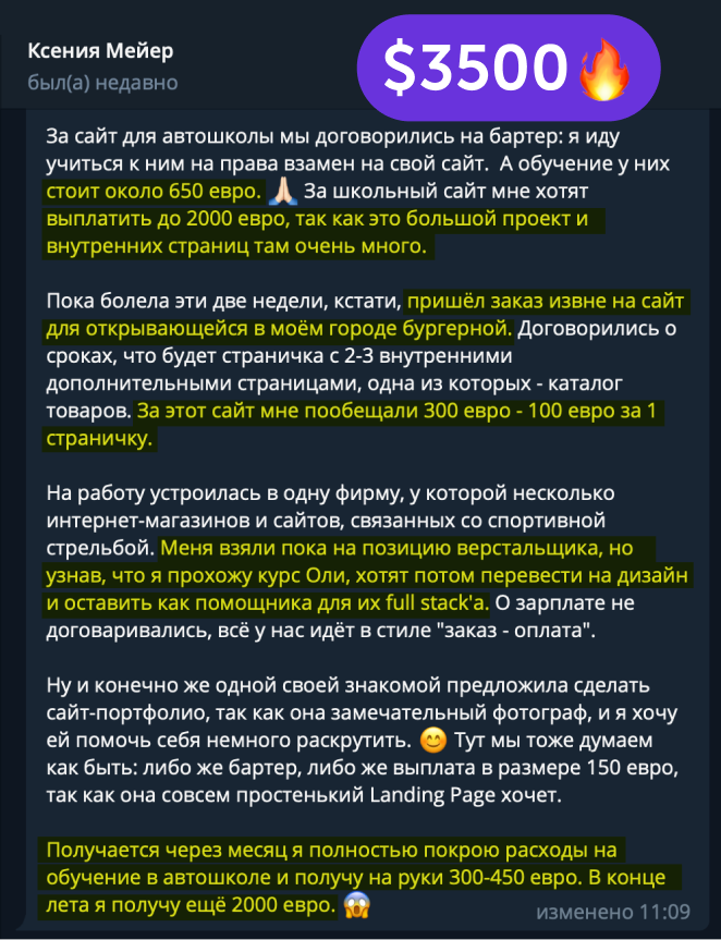 В канале мы честно размещаем самые разные реальные успехи студентов курса: от первых 10$ до трудоустройств в компании с зарплатой 3000$