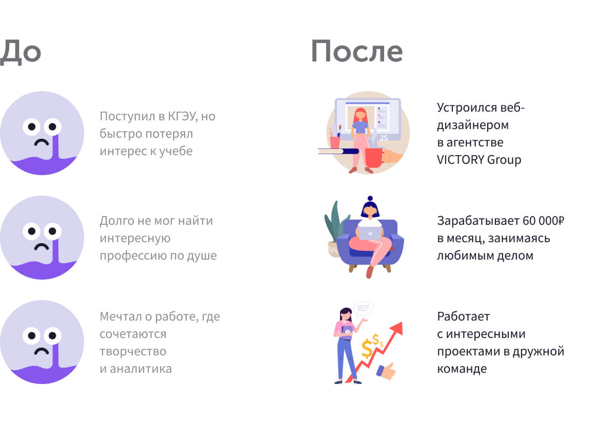 Я учился на энергетика, работал официантом и светотехником. Нашёл себя в дизайне, и через 1,5 месяца после курса я устроился в VICTORY Group с зарплатой в 60.000₽ после первого же собеседования