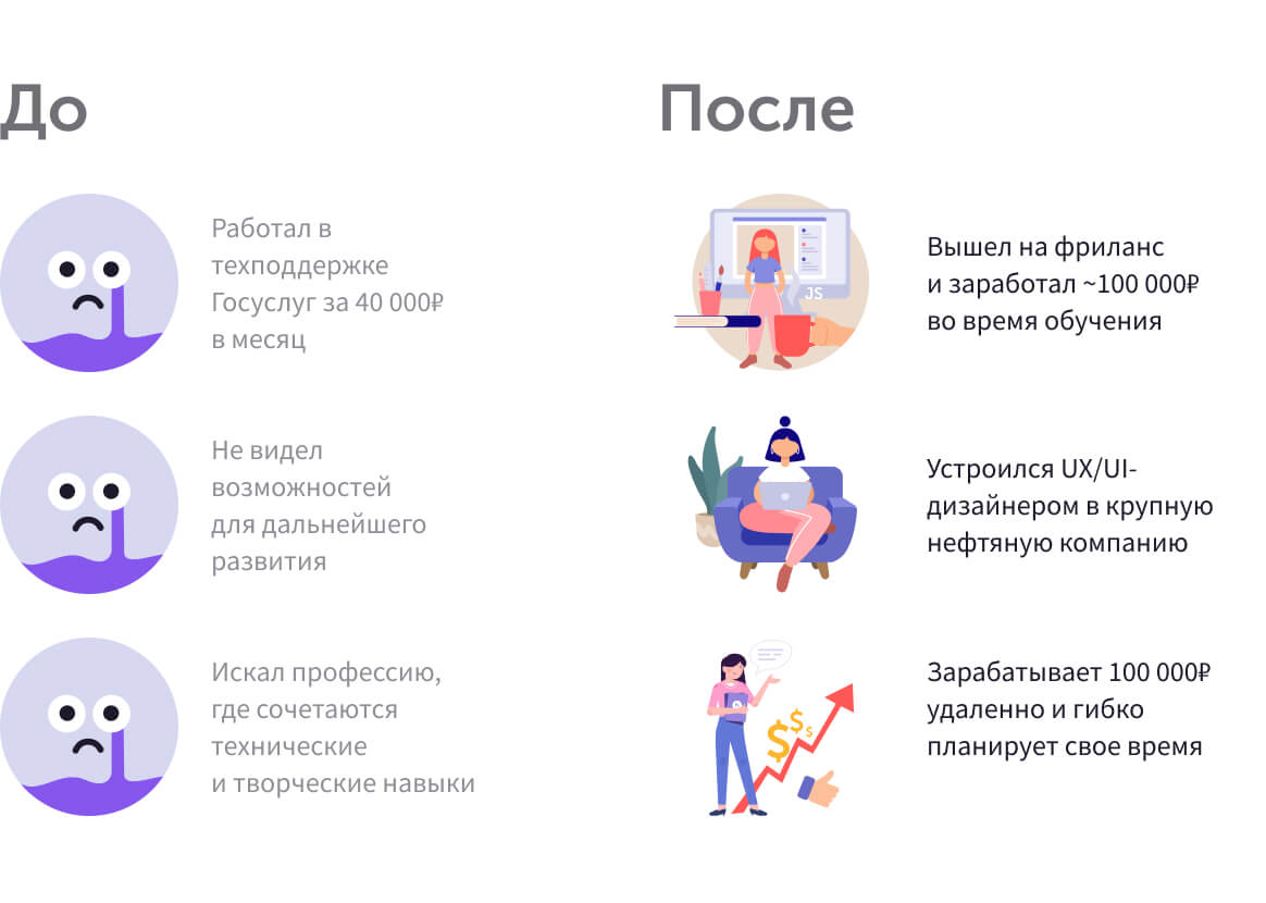 В конце беседы мы попросили нашего выпускника рассказать, как изменилась его жизнь в целом после курса «UX/UI-дизайнер», и дать советы своим будущим коллегам, которые сейчас только присматриваются к этой специальности.