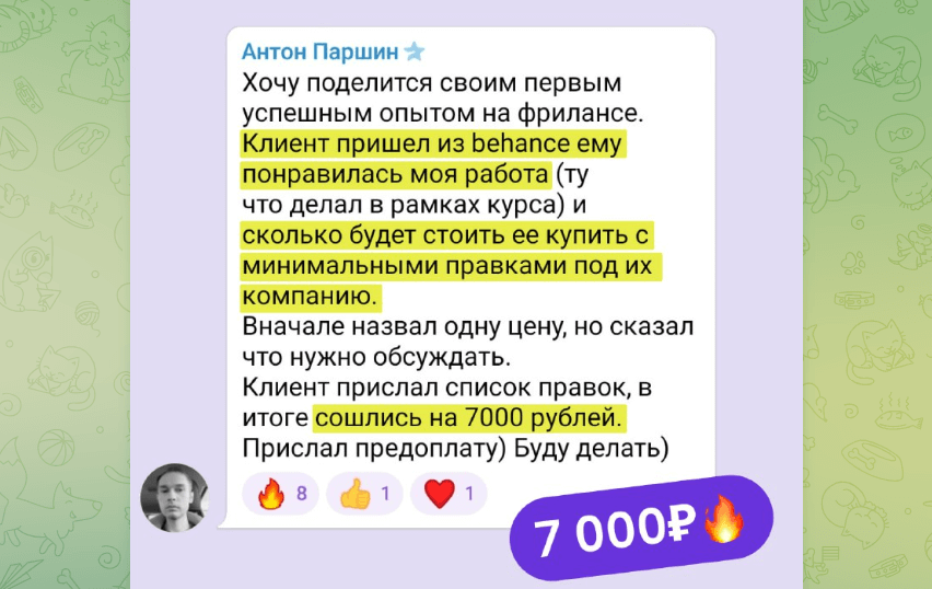 — Самым волнительным и запоминающимся для меня оказался модуль по фрилансу. Потому что одно дело — учиться и выполнять задания «в стол», и совсем другое — видеть и понимать, что твои работы нравятся другим и за них реально платят.