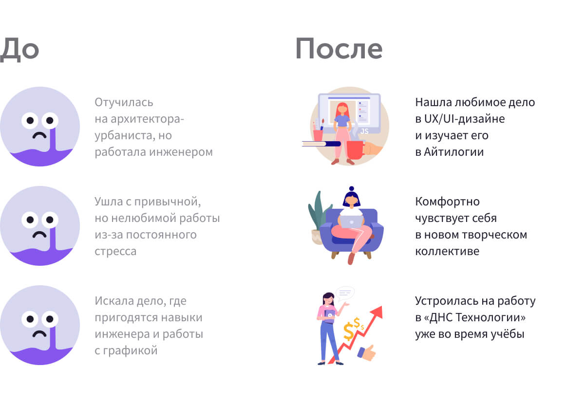 — Это произошло, когда я прошла 10 модулей курса, чуть больше половины программы. В тот момент мне предложили выгодный оффер по прежней специальности. Я оказалась перед выбором: либо начинаю работать UX/UI-дизайнером, либо остаюсь в строительной сфере.— С чего ты начала поиски?