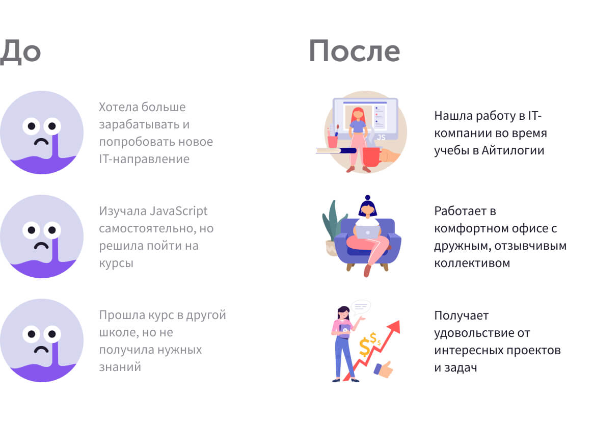 — Главное изменение в том, что теперь я с удовольствием иду на работу и иногда не замечаю даже, когда наступает конец рабочего дня. Я вижу свои перспективы в этой IT-специальности и четко вижу и понимаю, как могу развиваться в ней дальше.— На твой взгляд, как решиться на изучение Frontend-разработки, несмотря на страхи и неуверенность в себе?