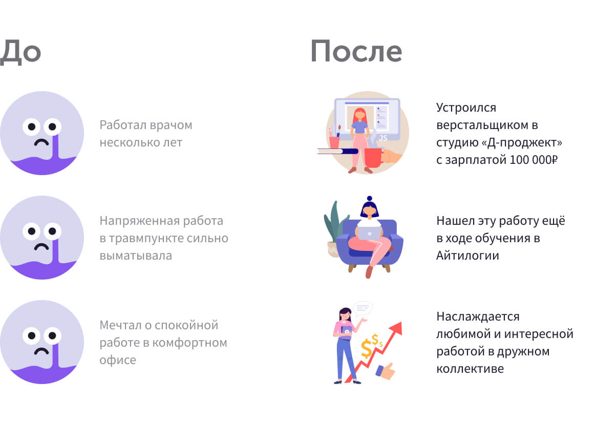 — Я советую в таких случаях сначала попробовать бесплатные вводные курсы, тот же интенсив «Frontend Start» в Айтилогии. Это поможет понять, правда ли человеку подходит специальность Frontend-разработчика и сфера IT вообще.И еще один общий совет: найдите конкретную цель, ради чего вы хотите освоить новую профессию. Эта цель будет вас мотивировать в процессе учебы.