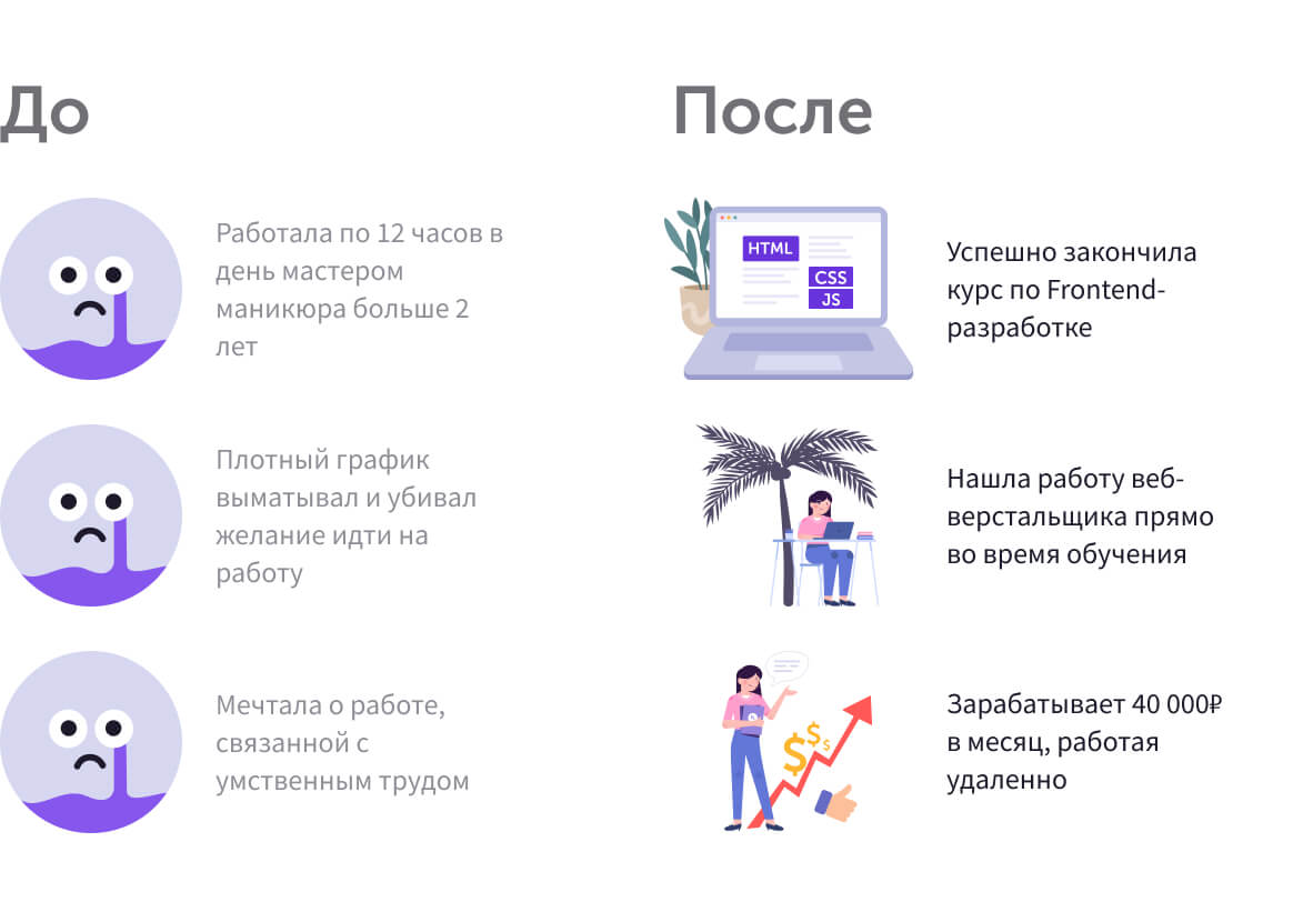 Я постоянно чувствовала свою нереализованность и это подтолкнуло меня сменить профессию. Во время обучения я нашла работу и теперь удалённо верстаю сайты для фармацевтических компаний из США и Европы с зарплатой 40.000₽