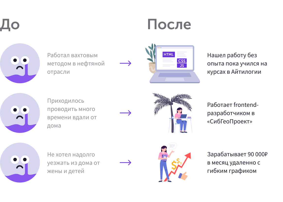 — Несмотря на все плюсы, был очень существенный минус — работать нужно было вахтовым методом. Неделю я жил в общежитии, неделю был дома. А когда наша семья переехала в другой город, мне пришлось перейти на вахту по 2 недели (2 недели на работе, 2 недели дома). Перспектива вот так постоянно быть вдали от жены и детей меня совсем не радовала и заставила задуматься о смене профессии. Я заинтересовался frontend-разработкой, даже попробовал изучать ее самостоятельно. Кое-что получалось, но я понял, что без полноценного систематизированного курса мое обучение растянется на годы. А я хотел как можно быстрее научиться разрабатывать сайты.— Из-за чего ты выбрал frontend-разработку, а не какую-то другую IT-специальность? Чем она тебя так заинтересовала?
