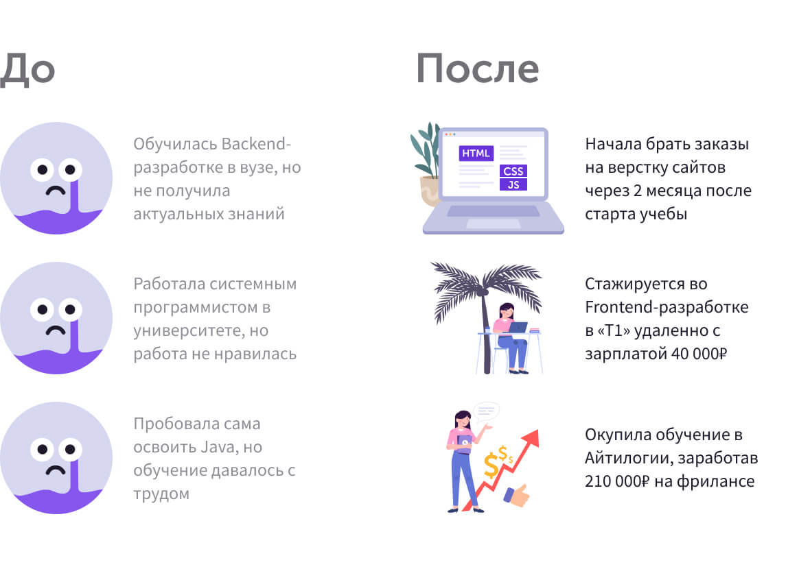 — Вообще мне сначала было очень страшно что-то менять, ведь я столько лет потратила на изучение Backend-разработки (4 года учебы и 2 года работы). Но потом я понемногу начала читать статьи про Frontend-разработку, рассуждала, стоит ли рисковать и менять профессию. А еще я прошла онлайн-тренажер по Frontend-разработке и присматривалась к соответствующему курсу в другой школе. Он оказался для меня очень дорогим, но к тому моменту у меня практически совсем опустились руки, я постоянно находилась в подавленном состоянии и всерьез задумывалась о покупке курса. Ведь если мне так сложно в Backend-разработке, может, это все-таки не мой путь.А потом я чисто случайно наткнулась на рекламу бесплатного интенсива Айтилогии «Frontend Start» и решила в нем поучаствовать. В итоге мне здесь настолько понравилось, что после интенсива я без раздумий купила основной курс «Frontend-разработчик» — вспоминает Марина свой непростой путь к решению сменить IT-специальность.