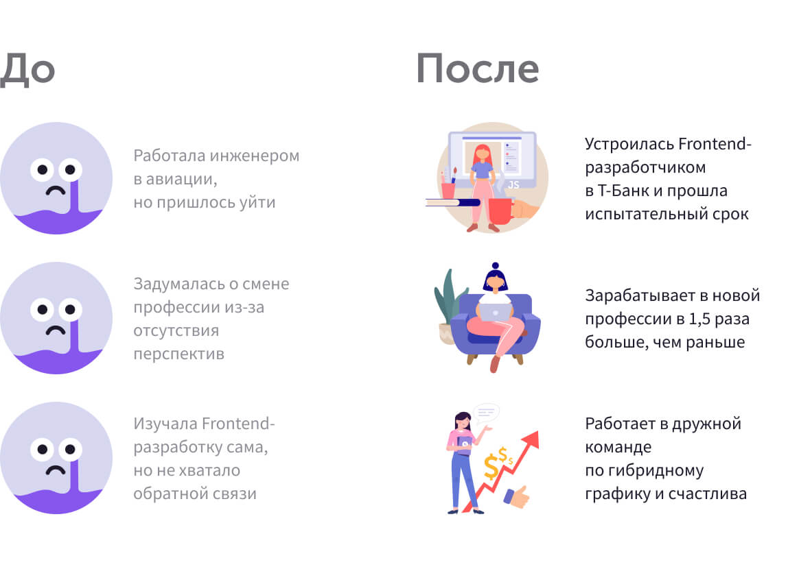 Сейчас я понимаю, что инвестиция в мое переобучение и в частности в курс «Frontend-разработчик» полностью окупилась. Хотя пока я искала работу, мне казалось, что это не так. Спустя примерно полгода поисков я даже думала бросить эту затею и остаться на прежнем месте, но тогда бы я прошла курс просто для себя, не достигнув намеченной цели. К счастью, я все-таки пришла к желанному результату и не жалею времени, потраченного на обучение и поиск работы, ведь итог того стоил на 100%! — радостно отмечает Марина.