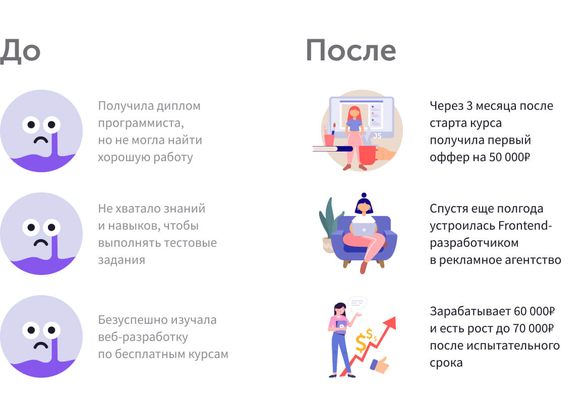 — Да, я стала более уверена в себе и поняла, что знаю и умею намного больше, чем раньше. И еще я думаю, что без курса «Frontend-разработчик», помощи наставников и преподавателя, вряд ли бы мне удалось добиться тех результатов, которые у меня есть сейчас. Я ведь уже пробовала обучаться самостоятельно, но из этого ничего не вышло.— Какие рекомендации ты можешь дать ребятам, которые хотят попробовать себя во Frontend-разработке, но не решаются действовать?