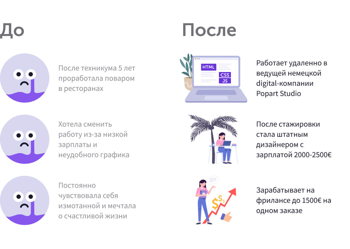 Я пять лет выматывалась поваром в бешеном графике за низкую зарплату. А сегодня я работаю из кафе у моря в ведущей компании Германии с доходом 2000-2500€, хотя начинала стажировку, практически не зная языка